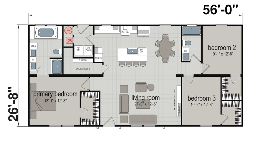 Discover what modern pre-fabricated housing has to offer by exploring the Ironclad 2856-08. This home is efficiently crafted to maximize space and size where it counts. It’s a 3 bed, 2 bath home that offers a unique layout and superior construction standards, all at an attractive price point. Make this model your own with an array of customization options designed to fit your lifestyle and preferences. Check out the floor plan and virtual tour to give you a more in-depth look at this home.